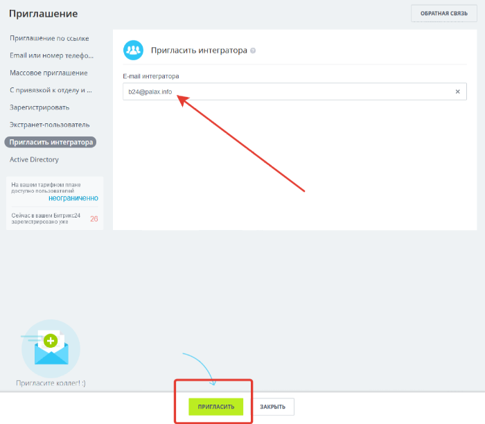 2. В появившемся окне выберите «Пригласить интегратора». В поле «E-mail интегратора» вставьте b24@palax.info. Нажмите кнопку «Пригласить».